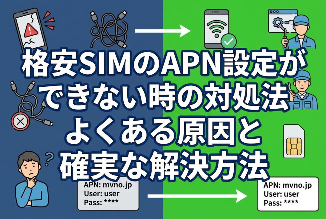 多くの場合、格安SIMのAPN設定ができないことが原因です。APN設定は格安SIMを使う上で必須の作業ですが、初めての方には難しく感じるかもしれません。